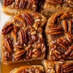 - Make the Pecan Sauce: Melt the butter in a small saucepan over medium heat. Stir in the brown sugar, corn syrup, maple syrup, cinnamon, and salt. Continue cooking and stirring for one more minute until the mixture is smooth and bubbly. Remove from heat and stir in the pecan pieces.