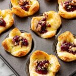 - Assemble: Place a piece of brie into the center of each puff pastry cup, then add 1 teaspoon of whole cranberry sauce on top of the cheese.