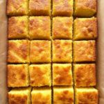 - Serve: Run a knife around edges to loosen. Lift bars out using the parchment paper overhang. Cut into 24 pieces. Optionally, sprinkle extra powdered sugar on top before serving.