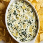 A creamy and delicious Spinach Artichoke Dip perfect for parties and gatherings, featuring a blend of cream cheese, sour cream, mayonnaise, garlic, parmesan, mozzarella, artichokes, and spinach baked to melty perfection.