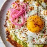 Crispy Feta Fried Eggs are a delightful breakfast or brunch dish featuring a perfectly cooked egg nestled on a warm tortilla with smashed avocado, topped with crispy, golden-brown feta cheese and garnished with pickled onions and chili oil for a burst of flavor.