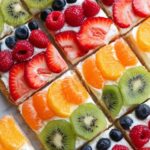 Spread the cream cheese topping evenly over your cooled cookie crust—don’t rush this, a smooth layer makes the finish look professional. Then comes the fun part: the fruit! Whether you decide on vibrant rows, a random mosaic, or even a fruit smiley face for the kids, use fresh and colorful fruit for the best presentation and taste. I love strawberries, blueberries, kiwi, and mandarin segments together—it’s like eating a rainbow.