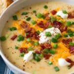 I almost always top my bowl with extra crispy bacon bits, sharp shredded cheddar, a dollop of sour cream, and fresh chopped chives. The colors and textures really lift the soup and add bursts of flavor in every spoonful. I’ve even added crushed crackers when I wanted extra crunch.